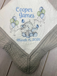 Elephant w Balloons Baby Quilt - First & Middle Names + Birth Date