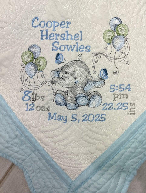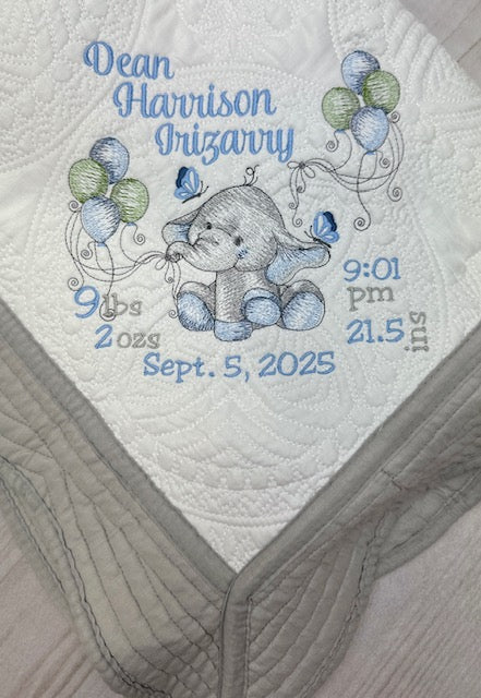 Your choice of embroidery elements ; baby's 1st name, middle name, birth date, weight, time, length. Options will appear when you place item in cart