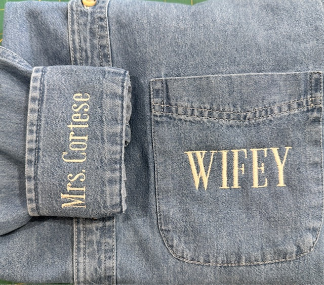 These button-down shirts are perfect for the wife to be. We embroider Wifey on the pocket and your new married name on the cuff. Wear this on your wedding day while getting hair and makeup done, perfect for bachelorette parties, makes a great engagement party gift or buy for yourself to wear after the big day. These shirts are so versatile!